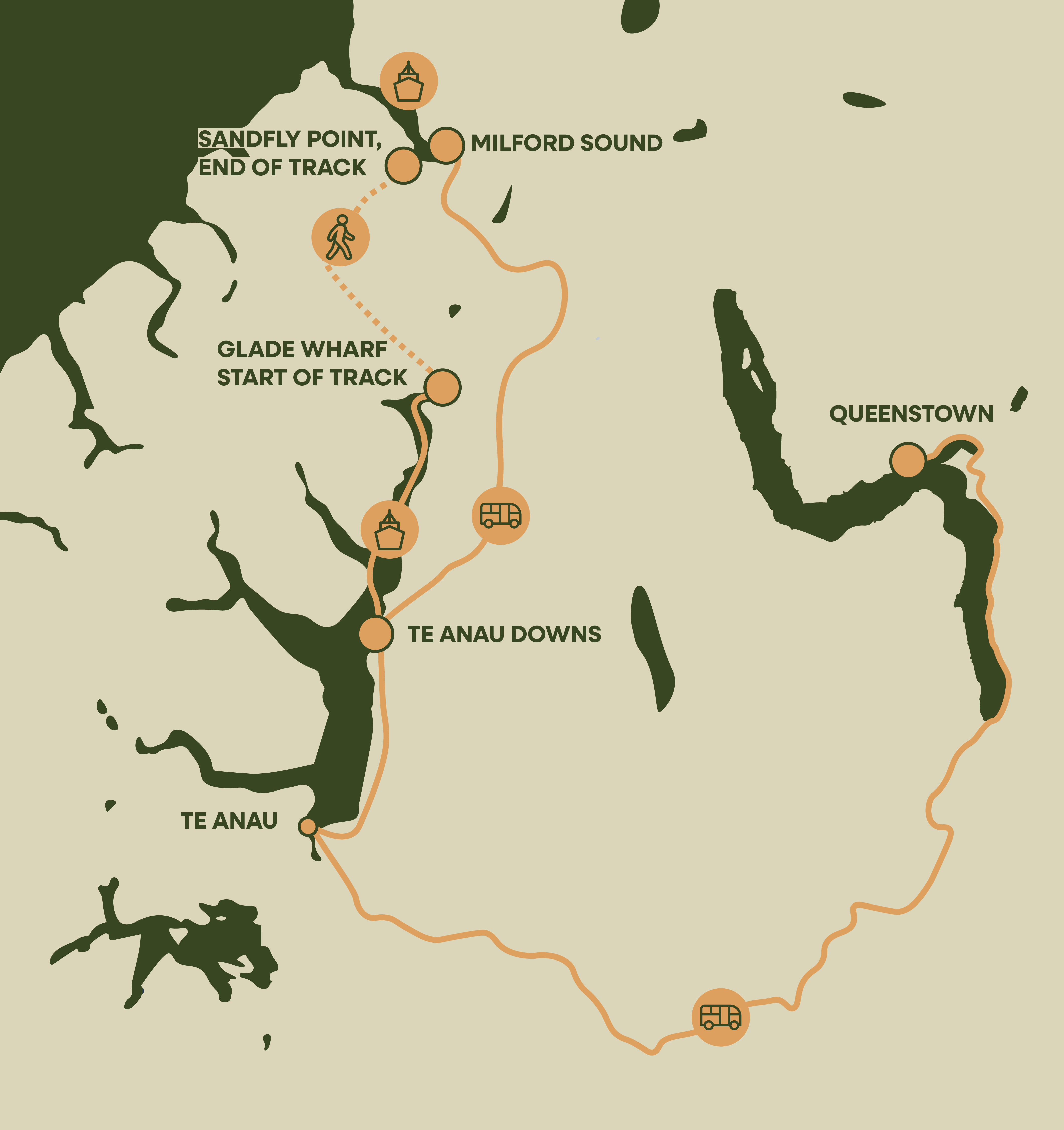 This option is best suited to walkers staying in Queenstown before and after their Milford Track experience. It provides a fully coordinated transport journey, including coach transfers to the track start and return transport from Milford Sound at the end of the walk.